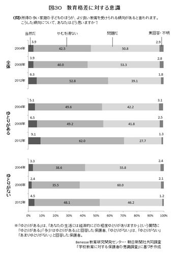 59.1%の家庭が教育格差を容認している 日本の自己責任論は生活保護バッシングだけでなく、教育の問題でも蔓延していることが確認できる。 ベネッセと朝日新聞が2012年、小中学生の保護者(6831名)を対象に行った調査では「豊かな家庭の子供のほど、より良…